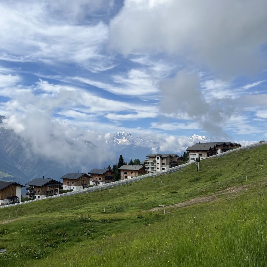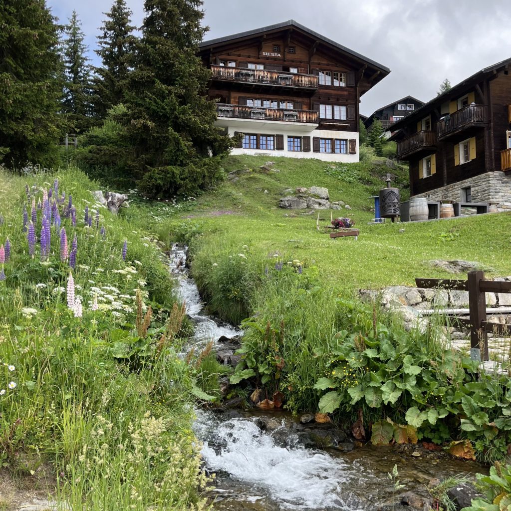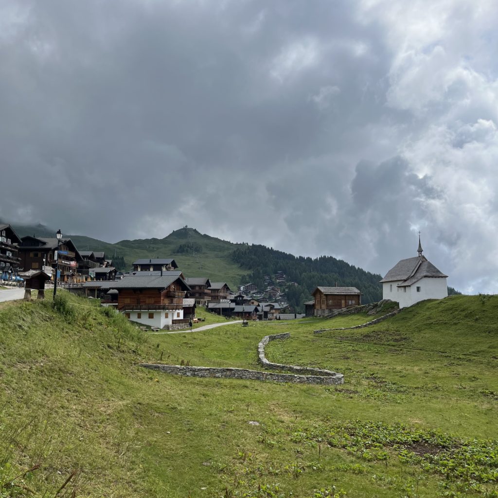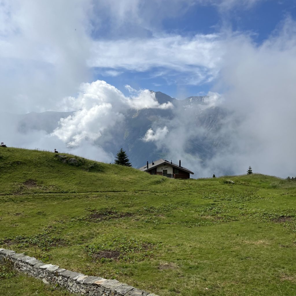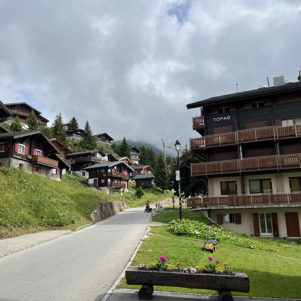 В 6:05 села на поезд из Женевы до Брига. В Бриге пересела на региональную электричку RE 42 с большими панорамными окнами. Я ездила на этой же электричке в Церматт, а сейчас мне нужно в противоположном направлении — до станции Bettmeralp Talstation. От станции по канатной дороге поднимаюсь до деревушки Bettmeralp (Беттмеральп). Беттмеральп — это горная деревушка, где нет машин, на лугах пасутся коровы, где едва ли проживает 500 человек местных жителей, но очень много туристов.
