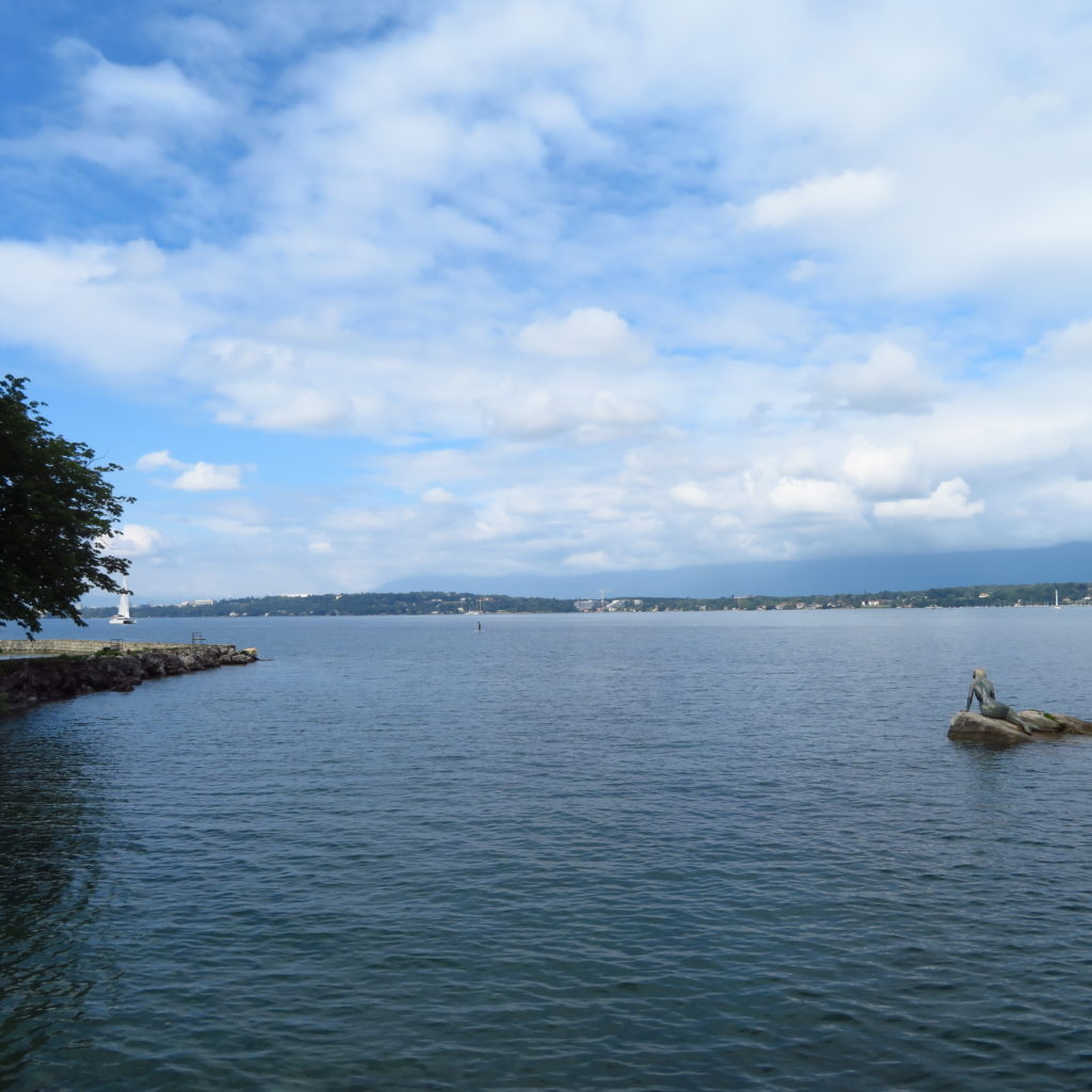 В ожидании прекрасного принца русалочка устроилась на камне, устремив свой взгляд на Женеву.