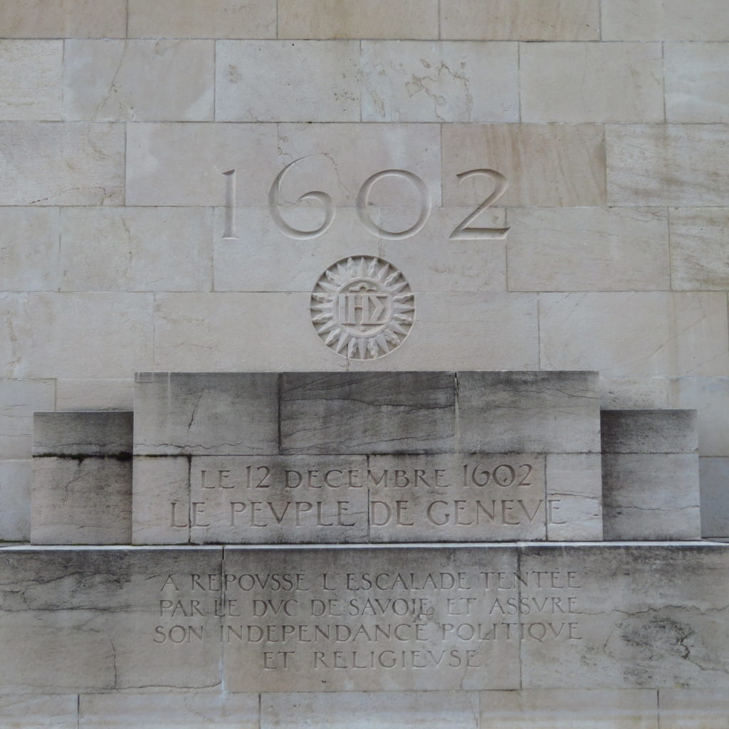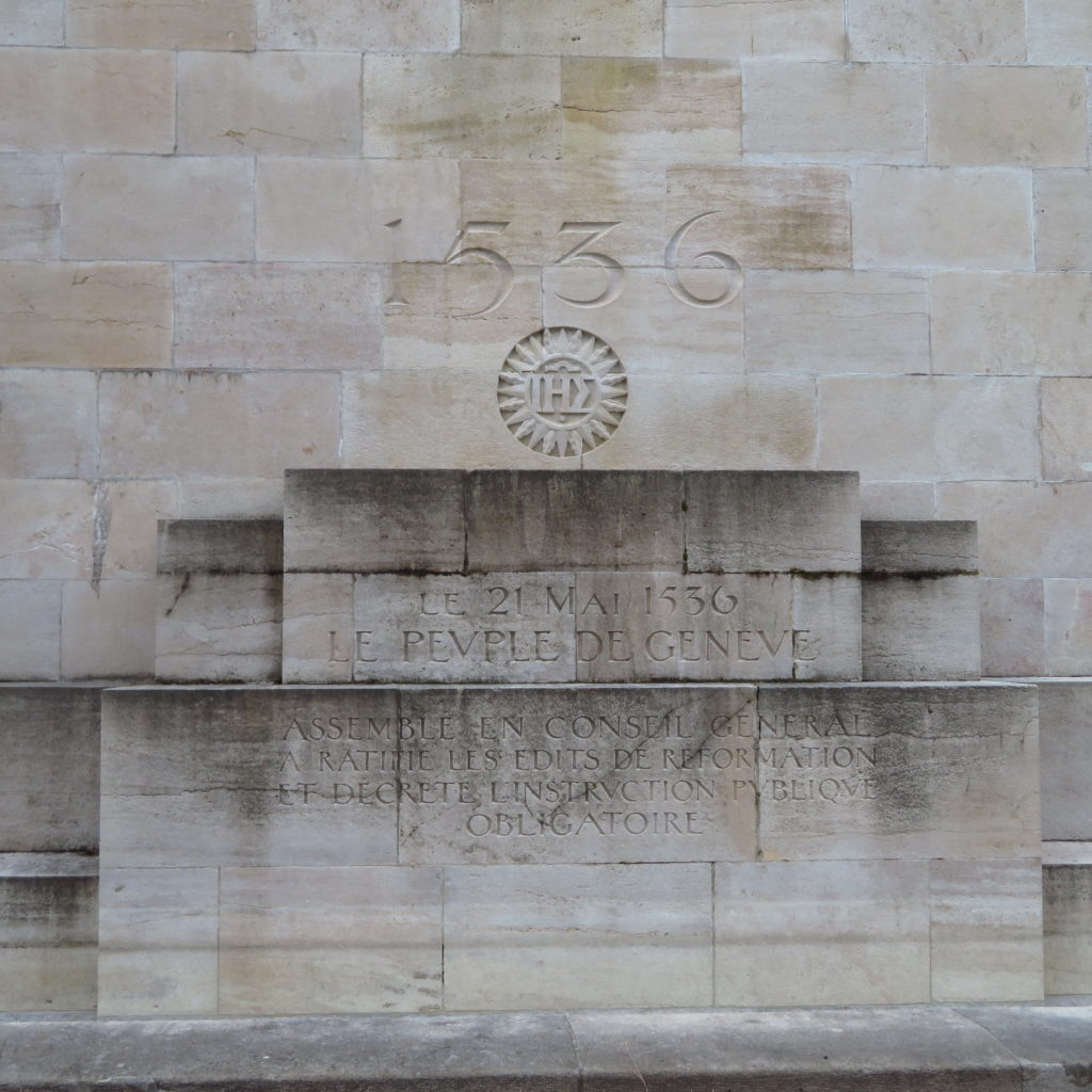 Вдоль стены, по обе стороны от центральной статуи, выгравирован девиз Реформации и Женевы: Post Tenebras Lux (лат. После мрака свет). На постаменте центральной статуи выгравировано ΙΗΣ.